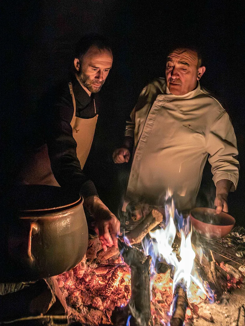 Bajo tierra, el fuego introduce otro elemento esencial, pues alrededor de la lumbre, el caldo de huesos, 48 horas de cocción, devuelve a la cocina a su origen.