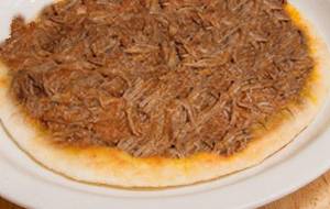 Cocinamos la sobrebarriga previamente y comenzamos picarla y a deshilacharla, colocamos la arepa en un plato para horno y agregamos los ingredientes, primero la carne, agregamos abundante queso y por último la salsa. La llevamos al horno por unos minutos y servimos. Que lo disfruten.