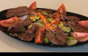 Se corta la carne para retirarle los sobrantes de grasa, menbranas, se corta cobre el tendon a 45 grados sin dañar la carne para posteriormente salpimentarla, se sacan unas tajadas en forma de mariposa para colocar sobre la ensalada, se calienta una cantidad al gusto de aceite y se colocan las tajadas de carne hasta que salgan los jugos de la carne, lo que indica que ya se puede colocar encima de la ensalada. Se agrega vinagreta al gusto y se sirve.