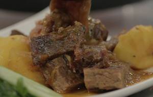 Colocamos la carne en el sarten caliente con aceite, le colocamos sal, pimienta, el hogao, el fondo, agua, tuberculos y agregamos al gusto las hierbas, lo tapamos y lo dejamos por 40 min, al emplatar, servimos nuestra carne con los tuberculos y la bañamos en la misma salsa. Buen provecho