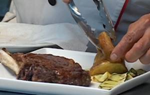 Se salpimienta y se lleva a la parrilla para marcarlo y sellarlo, despues se lleva al horno durante 25 min, se colocan los zukinis previamente tajados en la parrilla para marcarlos y asarlos y se fritan las papas criollas en forma de cascos, se llevan al plato el chuletón, el zukini y las papas. Disfrutenlo.