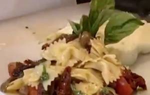 A la pasta previamente cocida, le agregamos los tomates cherry partidos por la mitad, albahaca finamente picada, los tomates secos y las aceitunas (negras y verdes), agregamos al gusto sal, pimienta y después el aceite de oliva y revolvemos todo. Al emplatar, servimos la ensalada, una porción generosa y tomamos el queso burrata y lo partimos por la mitad para apreciar su textura, acompañandolo de unas ramitas de albahaca. Disfrútenlo.