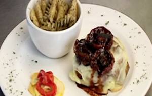 Llevamos la porcion de Lomo a la plancha para sellarla, se saca del sarten y se lleva a un plato para gratinarla con las Berenjenas previamente desangradas y asadas a la plancha y una tajada de queso mozarella. Se pasa a la salamandra o horno electrico y se deja por un tiempo de 5 minutos. Mientras se hornea el Lomo, preparamos una pasta al pesto con crema de leche. Al emplatar colocamos la pasta en un recipiente, acompañando el plato con rodajas de zuquini, morrones y colocamos el Lomo con los tomates secos encima del queso con un poco de aceite de oliva. Que lo disfruten!!!
