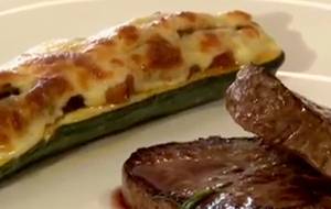 Preparación Cortamos los medallones del lomo, le agregamos la sal parrillera para que tenga un mejor sabor. En un sartén colocamos los medallones para sellarlos, preparamos el calabacín retirando la pulpa y llevandola a una sarten para prepararla con cebolla, tomate, ajo, condimentos y mantequilla, todo esto para preparar un delicioso guiso. Al emplatar el calabacín, le colocamos sal y unas láminas de queso y la metemos al horno por unos minutos gratinandose. Colocamos en el plato los medallones y el calabacín para empezar a disfrutar. Buen provecho!!!