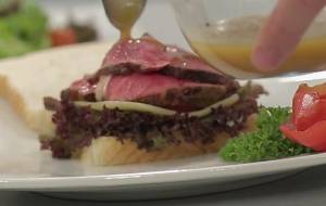 Sellamos nuestro lomo de aguja por todos lados mientras cocinamos las verduras previamente picadas, colocamos las verduras en una bandeja para horno y encima nuestro lomo sellado. Agregamos a las verduras el fondo o caldo de res y de ahi sacamos la salsa. Para emplatar, cortamos nuestro lomo en finas capas y las colocamos en los panes para tener finalmente nuestro sandwich, agregamos un poco de nuestra salsa y listo. Buen provecho.