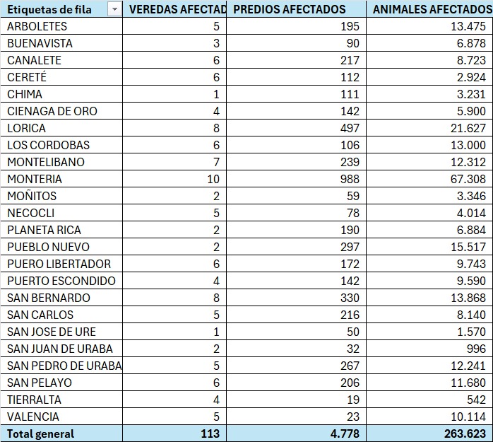 Estas son las cifras de veredas, predios y animales afectados por la ola invernal en los municipios de Córdoba. Fuente: Fedegán-FNG