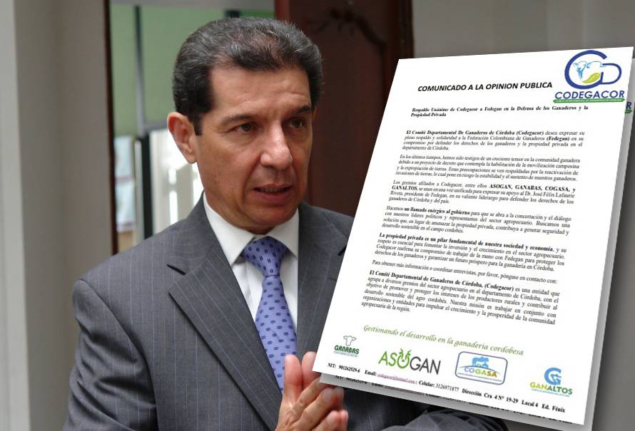 De igual manera, el Comité Departamental de Ganaderos de Córdoba (Codegacor), que asocia a su vez a los gremios ganaderos Asogan, Ganabas, Cogasa y Ganaltos, expresaron su apoyo al líder del gremio cúpula de la ganadería y reconocieron su “valiente liderazgo” para defender los derechos de los ganaderos de todo el país, argumentando que la propiedad privada es un pilar fundamental de nuestra sociedad y economía.