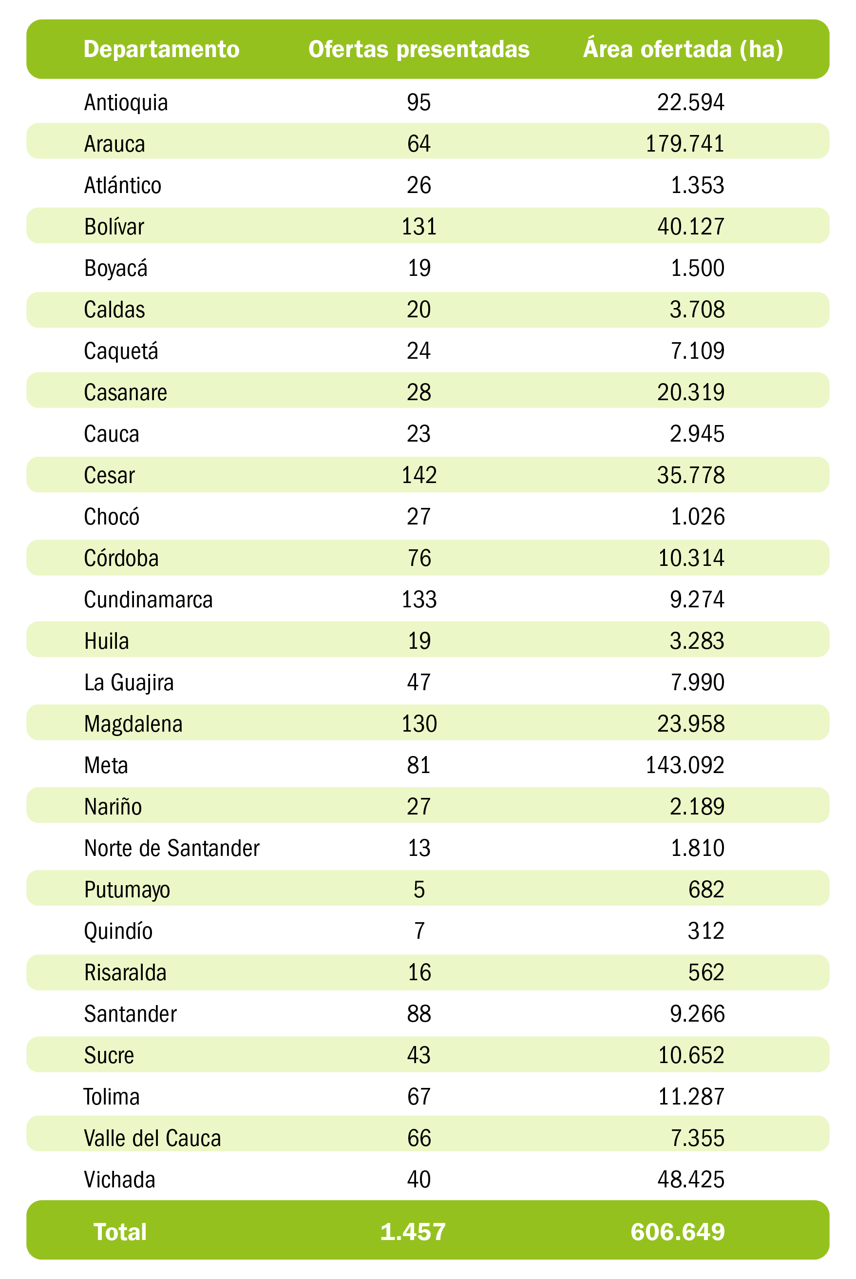 “Cesar, Cundinamarca, Bolívar y Magdalena registran el mayor número de ofertas con 142, 133, 131 y 130, respectivamente. Al observar la cantidad de tierras, Sucre lidera con 179.741 hectáreas, seguido del Meta con 142.092 ha, Vichada con 48.425 ha y Bolívar con 40.127 ha”, agregó el dirigente gremial