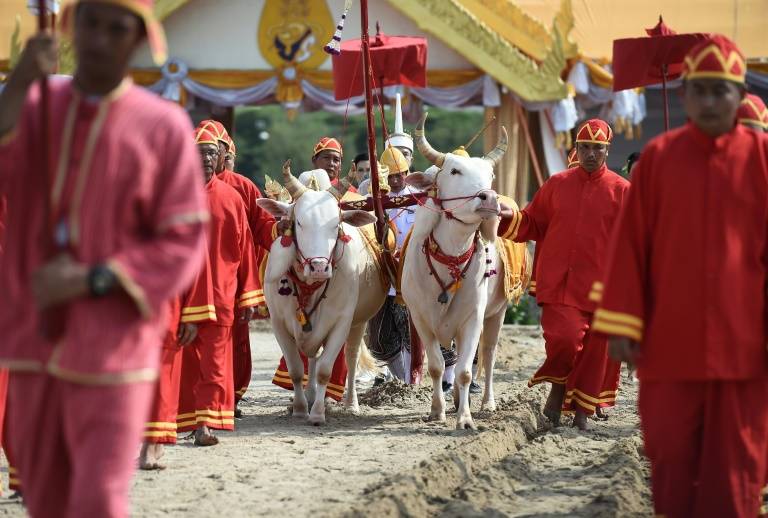 Sumida en la sequía y el calor aplastante desde hace semanas, Tailandia recibió con alegría el auguro de los búfalos sagrados que predijeron el lunes una temporada de lluvias abundantes y por consecuencia, de buenas cosechas. Presidida por el príncipe heredero Maha Vajiralongkorn, la ceremonia real durante la cual el anuncio fue hecho marca el inicio de la temporada del cultivo del arroz. Colocados delante de varios recipientes de comida, estos dos animales, seleccionados cuidadosamente por su temperamento y sus atributo físicos, escogieron el arroz, el sésamo, el heno, el agua y el alcohol. (Lea: 18,4 millones de litros de leche producen las búfalas en Colombia) Una mezcla que significa "precipitaciones suficientes, cultivos abundantes y mejores exportaciones", según el ministerio de Agricultura. El año pasado sin embargo los búfalos pronosticaron una buena temporada de lluvias y de cosechas y el año resultó funesto en cuanto a precipitaciones. Como la mayoría de los países de la zona del gran Mekong, Tailandia sufre una grave sequía. Casi todas las reservas se encuentran en un nivel históricamente bajo, tras un 2015 con pocas lluvias. En miles de pueblos del noreste y del centro del país ya no sale agua del grifo y esperan con impaciencia la temporada de lluvias, de cuatro o cinco meses, que empieza en junio. En este contexto, la junta en el poder desde hace casi 2 años, prohibió a los agricultores plantar arroz en la temporada seca, lo que supuso una fuerte reducción de la producción de arroz, de cerca del 30 %, a 25 millones de toneladas. Una consecuencia grave para uno de los principales productores de arroz en el mundo. (Lea: Búfalos resisten más enfermedades pero requieren buen control sanitario) El fenómeno climático de El Niño, que comenzó el año pasado, es uno de los más devastadores y conlleva importantes repercusiones en el sudeste asiático, donde una gran parte de la región tiene que soportar temperaturas superiores a los 40°C.