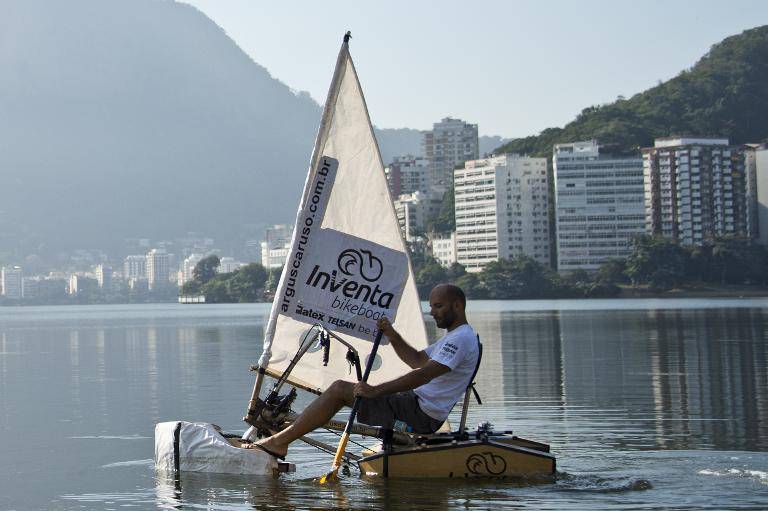 Un arquitecto brasileño presentó el pasado martes una bicicleta que rueda tanto por tierra como en el agua con el objetivo de llamar la atención sobre la necesidad de crear nuevas formas de transporte en las grandes ciudades. "Quiero incitar a la gente a que piense nuevas formas de movilidad urbana utilizando energías limpias", afirmó Argus Caruso Saturnino, de 40 años, a la orilla de la laguna de Rio de Janeiro, donde se disputarán las pruebas de vela en los Juegos Olímpicos de 2016. (Lea: Producir agua mientras se pedalea es posible) La "Bikeboat InVenta" de Saturnino, quien se hizo conocido por haber recorrido 28 países en bicicleta con el mismo fin, mide dos metros de largo por 90cm de ancho. Pesa 30 kilos y fue adaptada con flotadores, una hélice y una vela. La idea, según su creador, es que la "Bike InVenta" se transforme en un medio de transporte en las ciudades con lagunas y ríos con el objetivo de que pueda utilizarse cuando se produzcan en inundaciones o atascos de tráfico. Esta bici podría servir igualmente de vehículo de apoyo a los amantes de la vela o, simplemente, para la diversión en los momentos de ocio. Construida con madera de uso naval y resina, además de llevar una vela de tela, "este prototipo es una provocación para que la gente no se convierta en esclava del auto y busque otros medios de transporte. Las ciudades están demasiado contaminadas. Debemos crear medios utilizando la energía limpia y la fuerza del cuerpo", opina Saturnino. (Lea: Bicicletas de bambú, estrellas del foro mundial en Medellín) Este arquitecto brasileño trabajó 3 años en el proyecto e invirtió 4 meses en su construcción. Las primeras pruebas las realizó en la Lagoa de los Ingleses, en Belo Horizonte (Minas Gerais, sudeste) y este mes Saturnino realizará una travesía deBotafogo a Urca, en la bahía de Rio "para filmar la reacción de la gente y recoger sus testimonios". Los próximos planes de Saturnino son seguir con más pruebas luego en Ubatuba (estado de Sao Paulo) antes de viajar a otras ciudades de Suramérica.