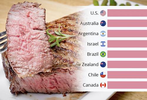 Aun así, Argentina ocupa el tercer lugar y el país famoso por el bistec en todo el mundo supera fácilmente a EE. UU. en consumo de carne de vacuno al consumir 39,9 kg per cápita al año. En la tabla del consumo total de todas las carnes, les siguen Israel (88,4 kg), Brasil (77,1 kg), Nueva Zelanda (74,8 kg), Chile (74,3 kg) y Canadá (68,9 kg).