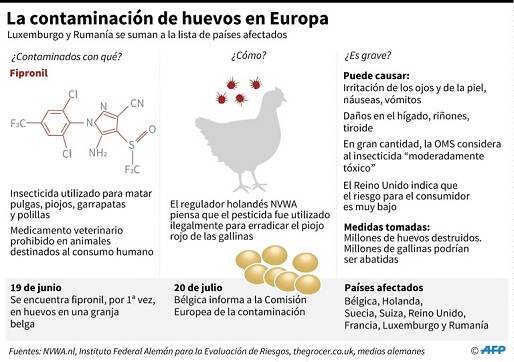 La investigación del fraude que ha dado lugar a la contaminación de millones de huevos de gallina en Europa por el insecticida fripronil ganó intensidad este jueves en Bélgica y Holanda, donde los directivos de una empresa, en el centro del escándalo, fueron detenidos. En Holanda, dos directivos "de la empresa que probablemente aplicó este producto en criaderos avícolas" fueron detenidos, según la fiscalía, que no precisó el nombre de la compañía. Pero, según los medios holandeses, se trata de ChickFriend, en el punto de mira de los criaderos afectados. En Bélgica se llevaron a cabo 11 registros "en todo el país" en el marco de esta investigación, que ya implica a 26 personas y empresas sospechosas, según la fiscalía de Amberes (norte). Precisa que "cerca de 6.000 litros de productos prohibidos" -de fipronil, según los medios- fueron incautados en julio en una empresa belga. La justicia no ha detallado de qué compañía se trata, pero fue identificada como el distribuidor de productos sanitarios para criaderos Poultry-Vision, en el origen del escándalo junto a ChickFriend, según los medios. El dirigente de Poultry-Vision compareció en julio y luego "fue liberado bajo estrictas condiciones", precisó la fiscalía, que "se toma los hechos muy en serio, en vista de su gravedad, su amplitud, su carácter organizado y su contexto internacional". El fipronil es un insecticida corriente que se encuentra en productos veterinarios utilizados para los animales de compañía, contra las pulgas, las garrapatas y los ácaros. Su uso está prohibido en animales destinados a la cadena alimentaria en la Unión Europea (UE). En grandes dosis está considerado "moderadamente tóxico" para el hombre por la Organización Mundial de la Salud (OMS). Diez países afectados Las operaciones se produjeron mientras que esta crisis sigue preocupando a las autoridades sanitarias europeas, pese a que los riesgos para la salud del consumidor sean, 'a priori', limitados. Además de los países de origen, varios afirmaron haber recibido huevos contaminados. Reino Unido anunció el jueves que 700.000 huevos contaminados importados habían sido utilizados en la fabricación de productos alimentarios. El mismo día, la Administración Veterinaria y de Alimentos de Dinamarca anunció que en el país se vendieron "20 toneladas de huevos cocidos y pelados de un proveedor belga", principalmente a "cafeterías y empresas de catering", contaminados con fipronil, aunque "no a un nivel nocivo para la salud humana". En Luxemburgo, el distribuidor Aldi tuvo que retirar lo que quedaba de dos lotes de huevos, uno de los cuales tenía una tasa de fipronil tan alta que no era apto para el consumo de niños de corta edad. En Francia, cinco empresas especializadas en productos derivados o transformados a base de huevos recibieron lotes contaminados, y un criadero fue bloqueado. 150 millones de euros en pérdidas La organización agrícola holandesa ZLTO consideró este jueves que el sector avícola podría registrar pérdidas de "al menos 150 millones de euros". En Bélgica, donde 50 explotaciones siguen cerradas, el Gobierno prometió en esta jornada aprobar medidas de apoyo para las empresas que se vean afectadas por la crisis.