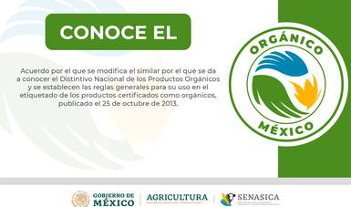 Con el fin de impulsar la producción y competitividad de los productos orgánicos mexicanos y posicionar su identidad en el mercado nacional e internacional, la Secretaría publicó en el Diario Oficial de la Federación (DOF) el Acuerdo por el que se modifica el similar por el que se da a conocer el Distintivo Nacional de los Productos Orgánicos y se establecen las reglas generales para su uso en el etiquetado de los productos certificados como orgánicos, publicado el 25 de octubre de 2013.