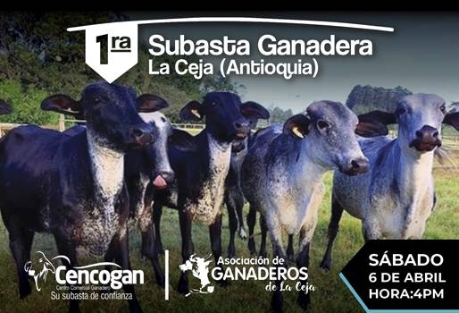 El Centro Comercial Ganadero (Cencogan) y la Asociación de Ganaderos de La Ceja (Asogan La Ceja) invitan a la primera subasta ganadera que se llevará a cabo en La Ceja-Antioquía.