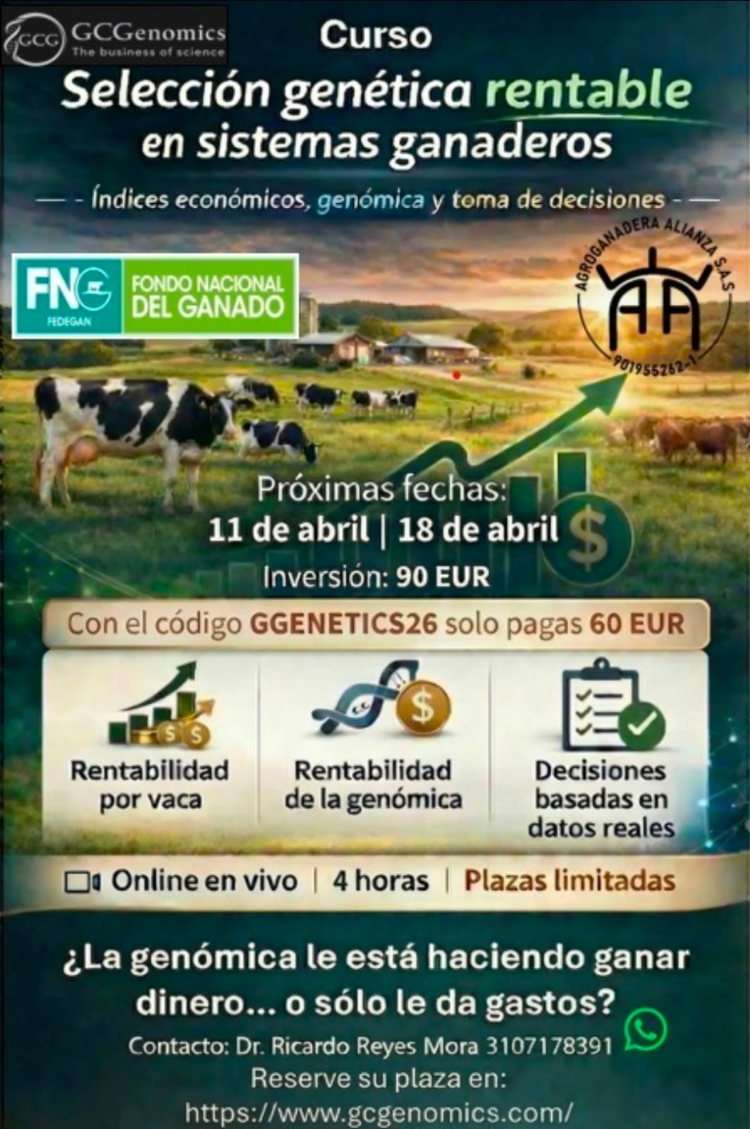 El curso se desarrollará en modalidad online en vivo, con una duración total de cuatro horas distribuidas en dos jornadas. Durante este tiempo, los participantes aprenderán desde los fundamentos económicos de la genética hasta la aplicación de índices de selección y simulaciones de rentabilidad.
