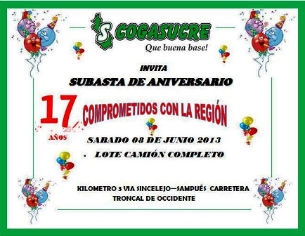 La Comercializadora de Ganado de Sucre, Cogasucre, está cumpliendo 17 años y por eso tiene preparado para sus clientes en el departamento una subasta especial el próximo sábado 8 de junio, a partir de las 3:00pm.