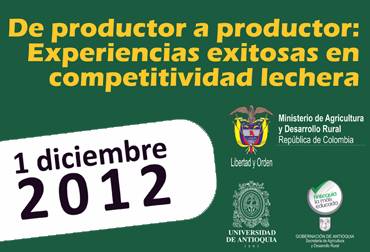 El próximo sábado 1 de diciembre en el Auditorio Ciudadela Universitaria de Robledo, de la Universidad de Antioquia, se llevará a cabo ‘De productor a productor: experiencias exitosas en competitividad lechera’, con el apoyo del Ministerio de Agricultura y Desarrollo Rural, la Gobernación de Antioquia y la Secretaría de Agricultura y Desarrollo Rural.