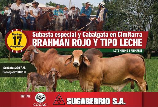 El evento tendrá lugar este 17 de septiembre en la sede de Cimitarra, Santander, y estará centrado en la comercialización de ganado tipo leche y Brahman rojo, con el fin de seguir fomentando el negocio ganadero en el Magdalena medio. De acuerdo con Omaira Guisao Benítez, gerente de la Subasta Ganadera de Puerto Berrío, Sugaberrío S.A., la empresa convocó a este encuentro especial en Cimitarra, como lo hace todos los meses. “Esperamos contar con unos 700 animales, entre comerciales y ganados seleccionados. Aunque el tema central Brahman rojo y tipo leche, también salen ejemplares Brahman blanco y gris de todas las categorías”, precisó la dirigente. (Lea: Con éxito volvieron las subastas a Sugaberrío) Los ganados comerciales se ofrecerán en lotes de mínimo 10 animales, mientras que los especiales como tipo leche y novillos Brahman rojo serán de 5 ejemplares. Según Guisao, esperan recibir alrededor de 400 personas, pues la idea es que los compradores también puedan participar de la cabalgata que se llevará a cabo tan pronto concluye la venta de los bovinos. “La cabalgata se hace en celebración del día de Amor y Amistad para los ganaderos de la región como una manera de integrarse con los caballistas de la zona y corregimientos vecinos”, señaló la gerente de Sugaberrío. (Lea: Ganadero, así se prepara un animal para una subasta comercial) Agregó que la empresa realiza un evento especial cada mes, con el fin de congregar a más compradores y brindar un espacio de confianza para ofrecer los mejores animales de las más dedicadas explotaciones pecuarias. Guisao señaló que los ganaderos deben cumplir con los requisitos sanitarios y técnicos más estrictos para inscribir a sus bovinos. (Lea: Brahman rojo, la cebú de gran habilidad materna) Al evento, irán compradores de Puerto Berrío (Antioquia), Puerto Boyacá (Boyacá), Puerto Parra, Bucaramanga, Barrancabermeja y Vélez (Santander), así como de otros municipios del Magdalena medio y de otras regiones del país. La gerente recalcó la importancia de continuar promoviendo el desarrollo de la ganadería, tras la emergencia vivida por los focos de fiebre aftosa y la cuarentena que frenó en parte el negocio, pero que a pasos lentos empieza su recuperación. “Los invitamos que se vinculen y nos acompañen al evento este fin de semana en Cimitarra, y después de hacer sus negocios, salgan a la cabalgata. También tenemos nuestras otras subastas regulares de Puerto Berrío y Sabana de Torres”, comentó la dirigente. La subasta inicia el domingo 17 de septiembre a las 4 de la tarde en la plaza de ferias de Cimitarra, seguida de la cabalgata a las 7 de la noche. (Lea: Productores en Antioquia advierten baja utilidad en venta de ganado) Al evento invitan el Sugaberrío y el Comité de Ganaderos de Cimitarra, Cogaci. Mayor información, comuníquese a los teléfonos (4) 8335543, 3178931590 y 3122867515.