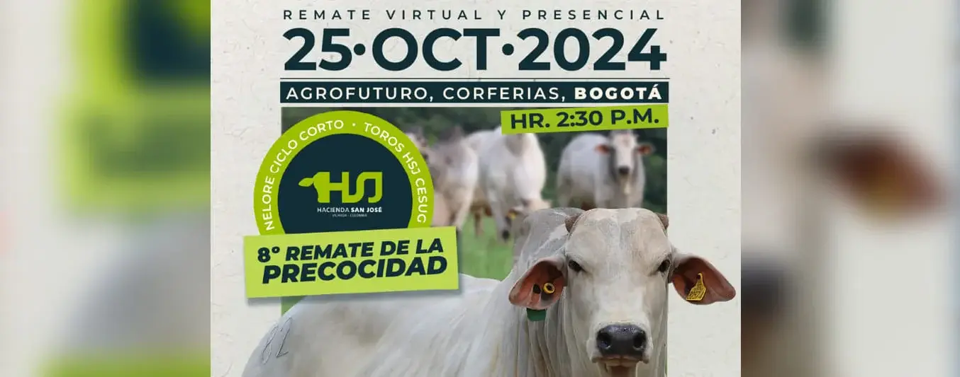 Hacienda San José líder en producción de carne y genética de nelore ciclo corto, anunció la realización de esta importante subasta ganadera nacional, que reunirá a ganaderos de todo Colombia. Esta es la 8ª versión, donde cada año se saca al mercado los animales que representan el avance y calidad genética de HSJ, oportunidad para que las ganaderías comerciales de todo el país puedan adquirir e impactar de manera positiva sus parámetros productivos y reproductivos.