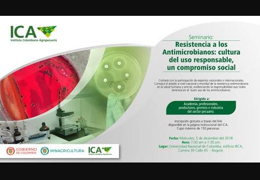 Los antimicrobianos son medicamentos que se utilizan para tratar las infecciones de origen bacteriano, el uso incorrecto de los mismos puede ayudar a la aparición de bacterias resistentes a la acción de estos fármacos, por esta razón, el ICA invita al seminario “Resistencia a los antimicrobianos. Cultura del uso responsable, un compromiso social”. El seminario se realizará en la ciudad de Bogotá, el 5 de diciembre de 2018, en el auditorio del IICA, ubicado en la Universidad Nacional de Colombia, en el horario de 7 am a 1 pm. Los antimicrobianos son medicamentos que se utilizan para tratar las infecciones de origen bacteriano, el uso incorrecto de los mismos, puede ayudar a la aparición de bacterias resistentes a la acción de estos fármacos, por esta razón, el ICA invita al seminario “Resistencia a los antimicrobianos. Cultura del uso responsable, un compromiso social”. El evento está dirigido a profesionales de la salud animal, la academia, estudiantes, productores y comercializadores de industria de los medicamentos relacionados con el área pecuaria. El seminario contará con la participación de expertos nacionales e internacionales, quienes aclararán con los participantes el concepto de Resistencia Antimicrobiana (RAM), e identificarán cada uno de los aspectos en los cuales nos hacemos actores en la interacción humano – animal. Otros temas que se desarrollan durante la jornada académica son: * Estado actual a nivel nacional y mundial de la resistencia antimicrobiana en la salud humana y animal, y la responsabilidad que tenemos en el buen uso de los antimicrobianos. * Reflexiones sobre el uso de antimicrobianos como promotores de crecimiento en producción animal * Beneficios que trae el buen uso de los medicamentos.