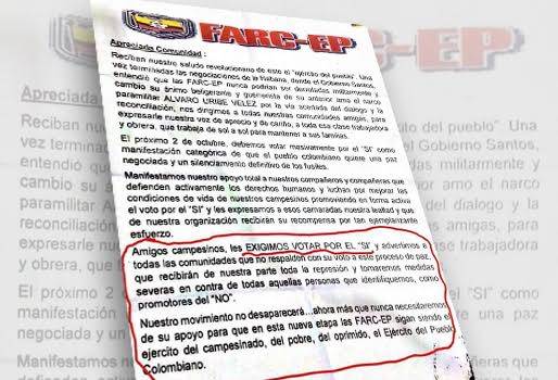 En algunas zonas del Bajo Cauca antioqueño ha sido entregado un documento presuntamente por parte de las Farc en donde les exigen a los habitantes de la región votar por el ‘sí. De paso aseguran que tomarán todas las medidas para aquellos que promotores del ‘no’.