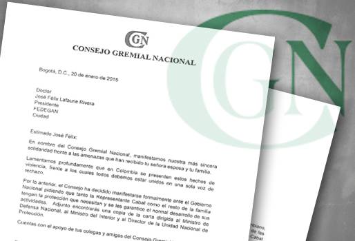 Otra muestra importante de apoyo la encabezó el pasado martes de 20 de enero el Consejo Gremial Nacional, CGM, liderado por Bruce Mac Master, desde donde le hicieron llegar una carta a José Félix Lafaurie, presidente ejecutivo de la Federación Colombiana de Ganaderos, Fedegán, en la que le expresan toda su solidaridad ante las amenazas que recibió Cabal y su familia.