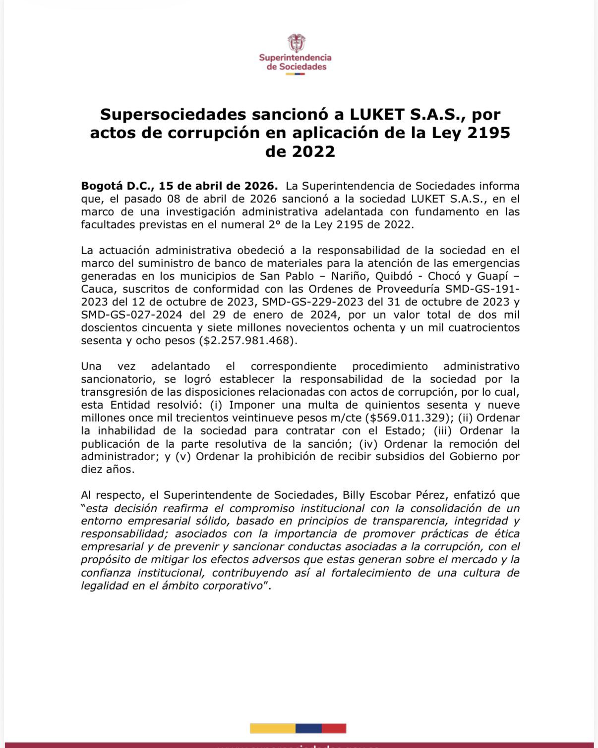 En su comunicado oficial, la Superintendencia fue contundente y, a través de auto administrativo, sancionó a Luket S.A.S. por actos de corrupción en contratos públicos, en aplicación de la Ley 2195 de 2022. Este pronunciamiento no solo ratifica la participación de actores privados en el entramado, sino que también evidencia cómo se articulaban los intereses entre funcionarios y contratistas para desviar recursos públicos.