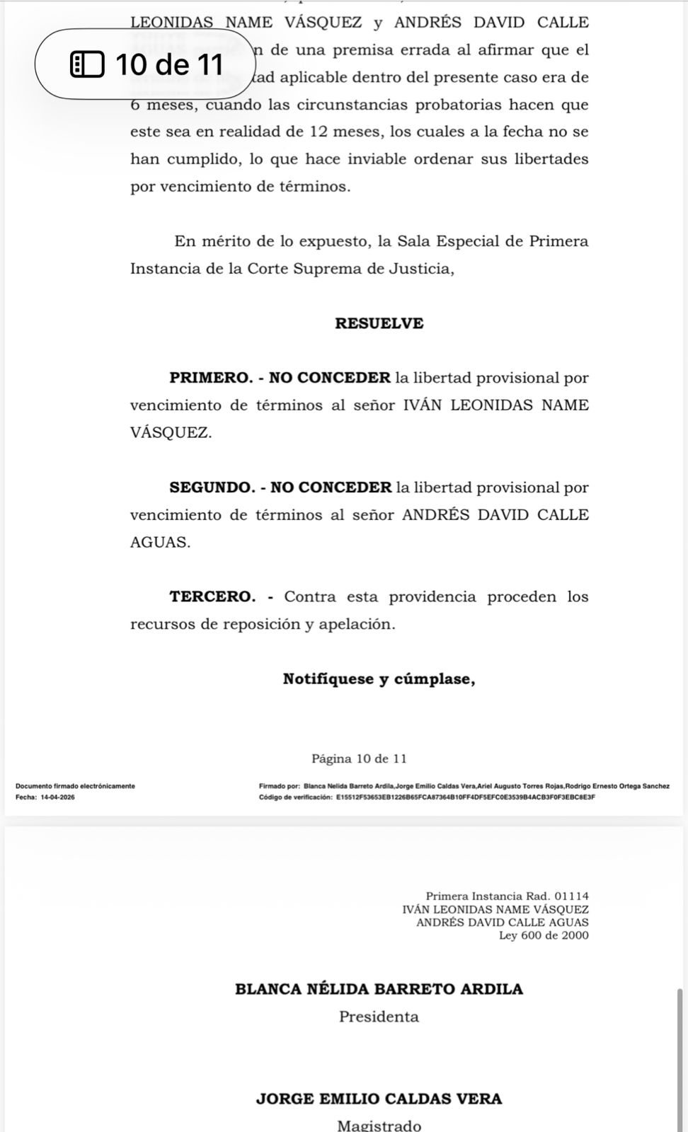 En paralelo, por vencimiento de términos, la defensa de los excongresistas Iván Name y Andrés Calle buscaba obtener su libertad. Sin embargo, la solicitud fue negada. Ambos fueron salpicados por, presuntamente, haber recibido sobornos provenientes del esquema liderado por Olmedo López, exdirector de la UNGRD, a cambio de favorecer intereses dentro del Congreso.