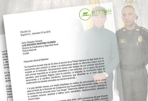 Luego de la decisión del Ministerio de Defensa de no ascender al brigadier general Luis Eduardo Martínez Guzmán, el gremio ganadero, en cabeza de su presidente ejecutivo, José Félix Lafaurie Rivera, le envió una carta en la que le ratifica su respaldo al alto oficial. La Federación Colombiana de Ganaderos, Fedegán, envío la carta al brigadier general Luis Eduardo Martínez Guzmán, luego de conocer la decisión adoptada por el ministro de Defensa, Luis Carlos Villegas, quien luego de recibir unos anónimos postergó su nombramiento. “El gremio ganadero espera que a la mayor brevedad posible se aclare toda esa confusa situación que se presentó en cuanto a la solicitud que hizo el señor ministro de Defensa Nacional y su posterior e intempestivo retiro de la misma, ante la honorable Comisión Segunda del Senado de la República, y que sean removidos los obstáculos que impiden su merecido ascenso”, sostuvo Lafaurie Rivera. (Lea: Fedegán y Dicar establecen compromisos para mejorar seguridad) En la misiva se deja claro que el país conoce que desde 2012 el oficial ha sido objeto de varios ataques anónimos, tras los que de inmediato se puso a órdenes de la Fiscalía y la Procuraduría, que hasta el momento no han abierto investigación alguna. El dirigente gremial afirmó que es habitual que los miembros de la Fuerza Pública estén sujetos a la censura y a los ataques, “lo que no es aceptable es que infundios carentes de verdad sean tomados por otras autoridades para poner en tela de juicio la honra de los funcionarios y afectar su normal y merecido ascenso en el servicio público”. Según el presidente de Fedegán, no deja de sorprender, y al mismo tiempo preocupar, que se usen instrumentos “viles y despreciables”, que obedecen a intereses oscuros y con ello se logre frenar el lógico y merecido ascenso de Martínez Guzmán. (Lea: Fedegán, presente en encuentro de seguridad para el posconflicto) Dentro de la carrera del alto oficial, que supera los 30 años de servicio, se destacan la desmantelación de varias redes de la banda criminal conocida como ‘Los Úsuga’, haber dirigido la captura de Rodrigo Granda Escobar, en 2004; y la operación Libertad que permitió la ubicación del campamento de alias ‘Raúl Reyes’, siendo ello el punto de partida de la operación ‘Fénix’, que concluyó con la muerte del insurgente. “Recientemente, hemos sido testigos de sus exitosas ejecutorias para proveer seguridad en el campo colombiano y sus esfuerzos, con el apoyo del gremio ganadero, para combatir flagelos como la extorsión el abigeato, la movilización ilegal de semovientes y el sacrifico clandestino”, le reconoció Lafaurie. Martínez Guzmán se encuentra actualmente al frente de la Dirección de Carabineros y durante sus años de servicio en la Policía Nacional se ha destacado en los distintos cargos que ha ocupado.