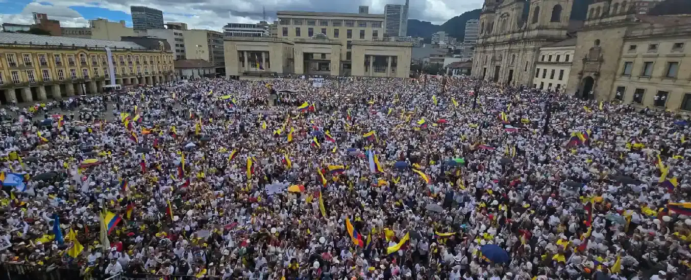 En Bogotá, la Plaza de Bolívar se llenó de manifestantes vestidos de blanco, ondeando banderas de Colombia y portando mensajes de apoyo para el líder político. En total silencio, caminaron con pancartas que pedían paz, justicia y unidad frente al odio.