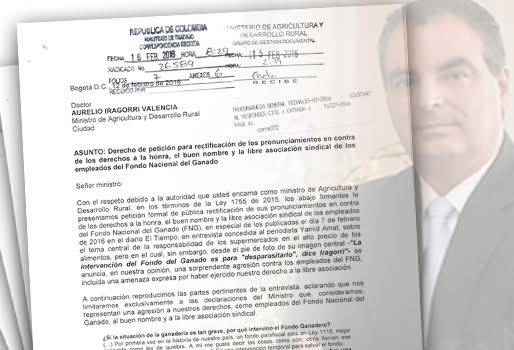 Luego de pronunciamientos en los que los calificó de “parásitos”, los más de 200 empleados del Fondo Nacional del Ganado enviaron una carta al Ministerio en la que le piden, respetuosamente, una rectificación pública por vulnerar sus derechos a la honra, el buen nombre y la libre asociación sindical.