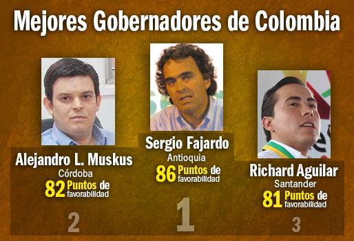 Con una calificación de 86 sobre 100, Sergio Fajardo, es considerado el mejor mandatario departamental. Por su parte Roberto Jaramillo, gobernador de Vaupés, obtuvo la más baja aprobación con tan solo 35 puntos.
