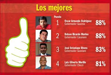 La firma sincelejana Inmediar reveló el escalafón en el cual Óscar Armando Rodríguez y Nelson Ricardo Mariño, son quienes tienen la mejor percepción por parte de guainianos y casanareños respectivamente, quienes aprueban su gestión en un 88%.