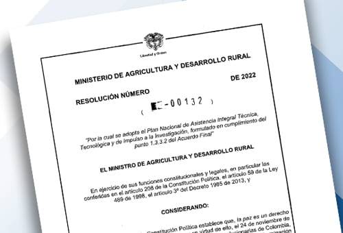 Por medio de la Resolución 0132 de 2022 el Ministerio de Agricultura y Desarrollo Rural adoptó el Plan Nacional de Asistencia Integral Técnica, Tecnológica y de impulso a la investigación.