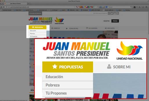Juan Manuel Santos es el único dentro del quinteto de candidatos a la Presidencia de la República que no destina en su página electrónica un espacio para explicar las propuestas que tiene para mejorar la calidad del sector agropecuario en el país, esto en caso tal de que saliese victorioso el próximo 25 de mayo.