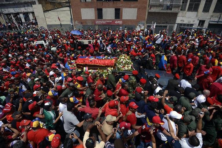 15H30 GMT: DESDE LOS TECHOS. Además de las calles llenas de gente, los venezolanos también acompañan el cortejo desde los techos de edificios y casas. Algunos cuelgan desde las rejas del hospital militar, donde falleció el mandatario. La multitud canta el himno nacional y ondea banderas de Venezuela a media hasta.