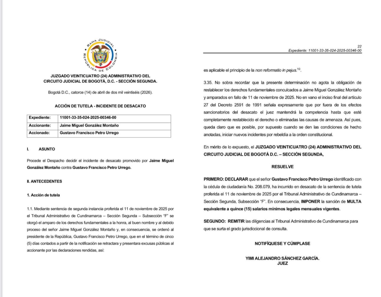 El presidente de la República, Gustavo Petro, fue sancionado por desacato tras incumplir una orden judicial que le exigía rectificar declaraciones en las que señalaba de corrupción a Jaime Miguel González Montaño, exgerente de la EPS Coosalud.