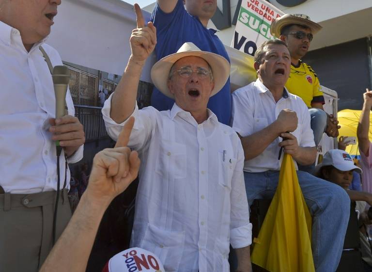 El expresidente colombiano Álvaro Uribe lideró este lunes una protesta contra el acuerdo de paz entre el Gobierno y las Farc en Cartagena de Indias, a pocas horas de que el presidente Juan Manuel Santos y el líder guerrillero Timochenko lo firmen de manera oficial. Uribe, uno de los líderes de la campaña por el 'No' en el plebiscito del 2 de octubre en el que los colombianos deberán aprobar lo negociado entre ambas partes, participó en una cadena humana de un centenar de personas en una plaza de la ciudad caribeña, entre gritos de "Colombia dice no!". "Un mensaje a la comunidad internacional: los mexicanos no le darían impunidad a los carteles de la droga. ¿Por qué hay que darle impunidad al mayor cartel de cocaína del mundo, las Farc, que es el gran proveedor de los carteles de México?", exclamó Uribe desde lo alto de una tarima. (Lea: Centro Democrático inicia campaña del NO al Plebiscito) "Los norteamericanos no le habrán dado impunidad a Osama bin Laden, tampoco los franceses le habrían dado impunidad a los de ISIS. Por qué los colombinos tenemos que darles impunidad total a terroristas que han golpeado tanto a Colombia como golpeó Bin Laden a Estados Unidos?, agregó. Uribe es, junto al también expresidente Andrés Pastrana, uno de los principales promotores del "No" al acuerdo de paz alcanzado entre el gobierno y las FARC tras casi cuatro años de negociaciones en La Habana, al considerar que traerá "impunidad a los guerrilleros". El acuerdo contempla que quienes confiesen crímenes atroces ante un tribunal especial podrán evitar la cárcel y recibir penas alternativas. Según encuestas publicadas en las tres últimas semanas, el "Sí" ganará con comodidad, y entre 28% y 38% de los votantes optará por el "No". (Lea: Expresidentes Uribe y Pastrana rechazan pacto con Farc) Lo pactado será considerado válido si la opción por el "Sí" recoge más de 4,4 millones de votos, y es superior a las adhesiones del "No", según estableció la Corte Constitucional.