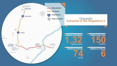 La otra obra que se va adelantar es 'Río Magdalena 2', en la cual se van a invertir $1,32 billones y van a ser sometidos a construcción 150 kilómetros, los cuales, después de ser caminos estrechos y maltratados, pasarán a ser vías a dobles calzadas con 74 puentes y 6 túneles, mejorando la movilidad de los municipios de Remedios, Alto Dolores y Puerto Berrío, en donde se conectará con la Ruta del Sol.
