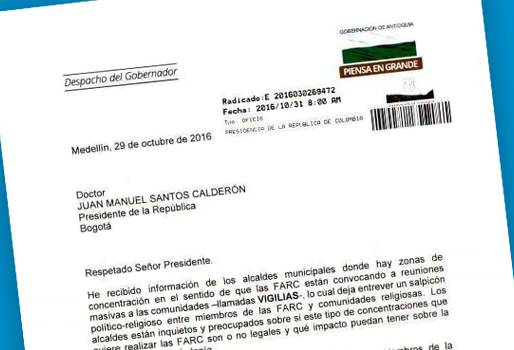 Así se lo hizo saber a través de una carta el gobernador del departamento, Luis Pérez Gutiérrez, al presidente Juan Manuel Santos. En sus palabras, hay un “salpicón político religioso entre miembros de las Farc y comunidades religiosas. El panorama en el país, luego del plebiscito del pasado 2 de octubre, ha estado convulsionado. Las negociaciones del Gobierno con promotores del No, del Gobierno con sus propios voceros, de las Farc, entre muchas otras, viene provocando un ambiente que en muchas oportunidades se torna complicado. Uno de los más preocupados es el gobernador de Antioquia, Luis Pérez Gutiérrez, quien decidió enviarle una carta al presidente Juan Manuel Santos para exponerle sus inquietudes sobre lo que viene sucediendo en la región. (Lea: ELN y Farc, 2 guerrillas que han sembrado el terror en Colombia) “He recibido información de los alcaldes municipales donde hay zonas de concentración en el sentido de que las Farc están convocando a reuniones masivas a las comunidades llamadas VIGILIAS, lo cual deja entrever un salpicón político religioso entre miembros de las Farc y comunidades religiosas. El mandatario local reseña en su comunicación, fechada el pasado 29 de octubre de 2016, que los alcaldes están inquietos y preocupados por no saber si este tipo de reuniones organizadas por miembros del grupo insurgente son legales o no y el impacto que las mismas pueden llegar a tener sobre la ciudadanía. “Como gobernador de Antioquia considero improcedente que miembros de la guerrilla que no se han desmovilizado estén convocando actos comunitarios en las poblaciones”, señaló. De igual manera, Pérez Gutiérrez le expresa que ha consultado con autoridades nacionales y ha encontrado respuestas contradictorias sobre la actitud que los gobernantes deben asumir en este tipo de casos. La carta del gobernador de una de las regiones más importantes de Colombia finaliza pidiendo al presidente Santos una directriz como máxima autoridad del país. (Lea: Ganaderos de Guaviare siguen siendo extorsionados por las Farc) Como “muy grave” calificó la denuncia hecha por el funcionario José Félix Lafaurie Rivera, presidente ejecutivo de la Federación Colombiana de Ganaderos, Fedegán, que además considera que se deslegitima así lo que la expresaron los ciudadanos en las urnas. La misma actividad se ha desarrollado en lugares como Uribe, Meta; Miranda y Buenos Aires, en Cauca; San Vicente del Caguán, en Caquetá; en el Catatumbo, en Norte de Santander, entre muchos ortos lugares de la geografía nacional. Otra de las situaciones que ha causado sensaciones encontradas, rechazo de unos y complacencia en los demás, es la presencia de hombres de la Policía Nacional. Algunos no entienden las razones por las que se prestan para este tipo de sesiones, así el ánimo sea el de la paz y la reconciliación. Algunos ciudadanos tampoco entienden por qué solo hasta ahora es que se promueven este tipo de actos por parte de las Farc, condenan que se estén despilfarrando recursos en ellos y coinciden en afirmar que aunque desean la paz, se debe esperar a que concluyan favorablemente las negociaciones que se adelantan en La Habana.