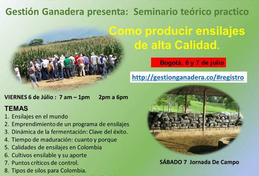 La empresa Gestión Ganadera lo invita a asistir a nuevo curso sobre técnicas de elaboración de silos de alta calidad en época crítica, que tendrá lugar en Bogotá. Incluye una jornada académica y un día de campo para que usted consulte cualquier duda y reciba la mejor capacitación. Germán García Borbón, zootecnista experto en nutrición bovina y director de la empresa Gestión Ganadera, propuso 10 preguntas que los asistentes podrán resolver asistiendo al seminario. (Lea: Así se calcula la cantidad de ensilado que debe suministrarse al ganado) 1. ¿Cómo calcular cuánto ensilado necesita y que área necesita para satisfacer sus necesidades de forraje? 2. ¿Qué materiales se pueden ensilar? 3. ¿Cuáles son los costos de un programa de ensilajes y como elaborar el presupuesto? 4. ¿Cuál es el momento óptimo de cosecha para recoger un forraje de alta calidad? 5. ¿A qué altura se debe corta el material y cuál es el tamaño de picado para lograr un ensilaje de alta calidad? 6. ¿Cuál es tiempo máximo que debe durar la cosecha para lograr un buen ensilajes? 7. ¿Conoce el uso y manejo de inoculantes bacterianos y aditivos? 8. ¿Tiene claros los conceptos de compactación, densidad, sellado y cobertura del silo? 9. ¿Cuánto tiempo debe dejar madurar el material y por qué? 10. La respuesta del suministro de ensilado en los animales depende su calidad: ¿sabe usted como reconocerla? (Lea: Preparar silos en condiciones húmedas sí es posible)