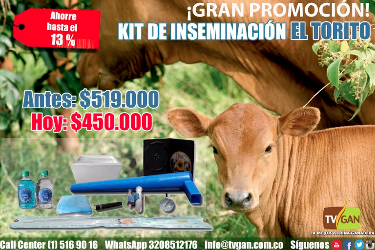 Pensando en ello y en ayudar a mejorar los índices de los productores de todo el país, TVGán tiene una gran promoción en su kit ‘El Torito’ con los cuales usted podrá garantizar mejores resultados en sus programas reproductivos. Al adquirir esta promoción, vigente únicamente por el mes de marzo, usted recibirá 20 consumibles, un vaginoscopio, la cava de descongelación, un termómetro, linterna y otros elementos igualmente útiles para llevar a cabo yd e manera exitosa los procesos de inseminación artificial. (Lea: El celo de la vaca lechera: Todo está en las hormonas) Sobre el precio habitual, TVGán le ofrece en este mes la posibilidad de ahorrarse un 13 % de descuento, lo que representa una reducción considerable sobre el precio habitual al que se encuentra en el mercado. Como si fuera poco, la invitación desde la considerada como la ‘vitrina ganadera del país’, la cual cuenta con el respaldo de la Federación Colombiana de Ganaderos, Fedegán, lo invita a que pregunte por la promoción de los consumibles que tienen el 20 % de descuento en producto adicional. Si usted se encuentra interesado en este o alguno de los productos del portafolio que tenemos disponible, no dude en ponerse en contacto con nuestros asesores. Puede llamar al teléfono en Bogotá (1) 5169016 o al celular 320 8512176. (Lea: TVGAN cuenta con ‘app’ para los ganaderos de Colombia) De igual manera, TVGán recomienda consultar siempre a su médico veterinario de confianza sobre la conveniencia de estos y todos los productos que utilice con los animales de su predio.