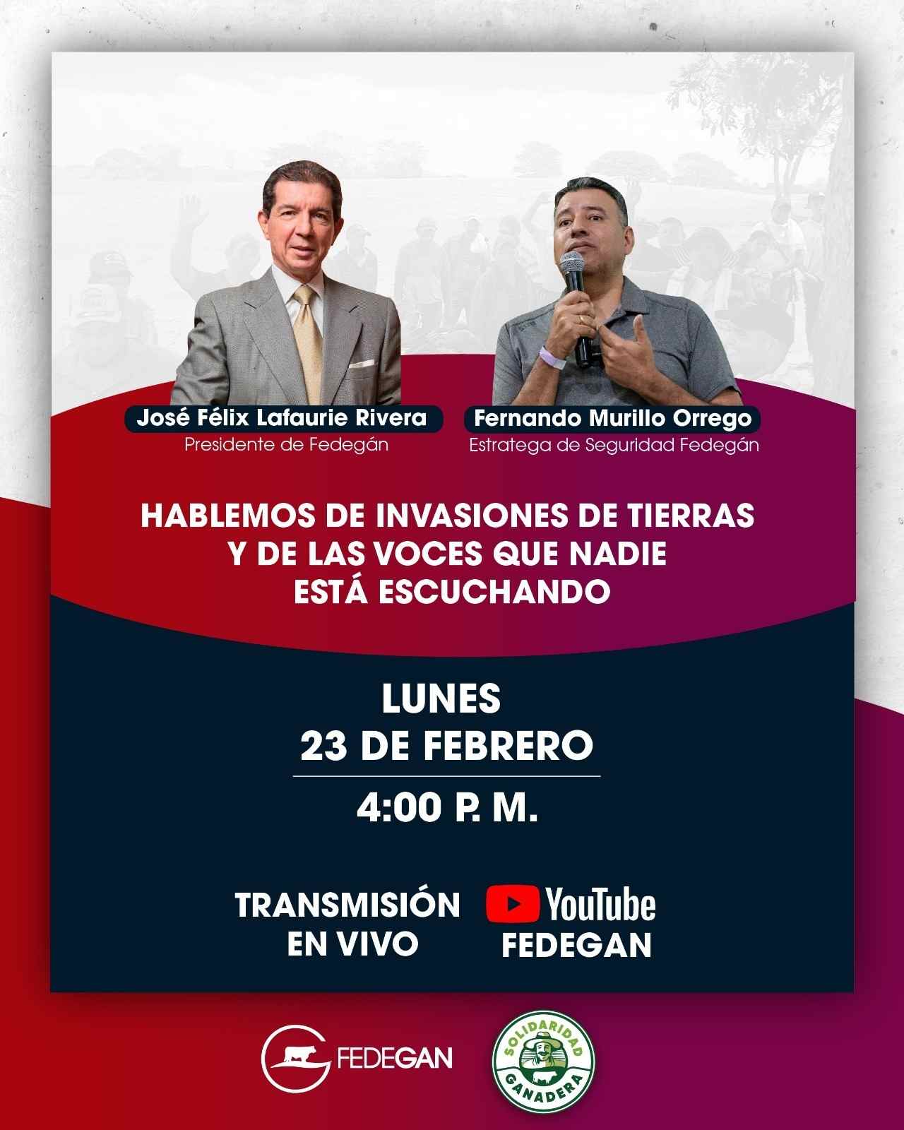 La Federación Colombiana de Ganaderos (Fedegán) invita a todos los ganaderos del país a un encuentro con el presidente ejecutivo, José Félix Lafaurie, y el general (r) Fernando Murillo, líder de los Frentes Solidarios de Seguridad y Paz, este lunes 23 de febrero a las 4 p. m. para hablar de lo que está pasando en relación con las recientes ocupaciones ilegales en distintas regiones.