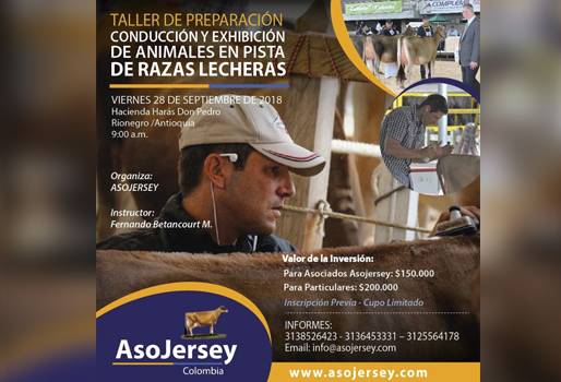 Para que usted aprenda acerca de cómo se debe preparar a un bovino para conducción y exhibición en ferias, la asociación ha preparado 2 talleres de capacitación, uno en Rionegro (Antioquia) y otro en Tocancipá (Cundinamarca). Liliana Quevedo Soto, directora ejecutiva de Asociación Colombiana de Criadores de Ganado Jersey, Asojersey, explicó que estas jornadas están destinadas para que los productores aprendan en detalle cómo realizar la presentación de sus ejemplares en eventos feriales. “En Rionegro vamos a estar en una de las fincas más representativas de Jersey. Sin embargo, el taller está encaminado al manejo de las razas lecheras, de cómo hacerles toda la preparación para la pista”, dijo. (Lea: Aprenda sobre calidad de semen bovino gracias a Asojersey) De acuerdo con Quevedo, esta capacitación pretende corregir las falencias en las que incurren los propietarios de ganado a la hora de mostrar sus animales en estos encuentros, así como también capacitar a aquellos que desean participar en una pista por primera vez y no cuentan con una persona que los asesore en el tema. Es por eso que los ganaderos en Antioquia podrán asistir a la capacitación dirigida por Fernando Betancourt, administrador de fincas ganaderas y experto en preparación de bovinos para ferias, que detalló los temas que harán parte de esta jornada. “La preparación va desde el manejo en la finca, la alimentación, la condición corporal de los animales, para luego enseñar cómo deben caminar y dejarse conducir por la pista, cómo se peluquean”, indicó. (Lea: Aprenda a seleccionar toros en la tarde académica de Asojersey) Debido a que se trata de un solo día, Betancourt aclaró que dictará una hora de teoría y el resto del tiempo lo dedicará a hacer muestras de manera práctica, que incluyen las pautas para realizar el corte de pelo en los ejemplares. Asimismo, especificó que el encuentro no estará centrado únicamente en ganado Jersey, sino también en ganado de leche y doble propósito, entre las que se incluyen Holstein, Ayrshire, Pardo Suizo, Gyr, Normando y Simmental, entre otras. “Si el ejemplar no se muestra bien en la pista, uno le da ventaja a los otros en el momento del juzgamiento, si están mal presentados, con un estado corporal bajo, que no se conducen muy bien en pista”, añadió. (Lea: ¿Por qué la raza Jersey es apropiada para producir leche en Colombia?) La primera cita es en la hacienda Harás Don Pedro, en Rionegro, el viernes 28 de septiembre a las 9 de la mañana, y el siguiente viernes 5 de octubre en la Hacienda Santa Helena en Tocancipá, que estará dirigida por el instructor Carlos López. La entrada es limitada, por lo cual debe inscribirse previamente. Consulte la página web www.asojersey.com, o escriba al correo [email protected]. También puede llamar a los teléfonos 313 8526423, 3136453331 y 312 5564178.