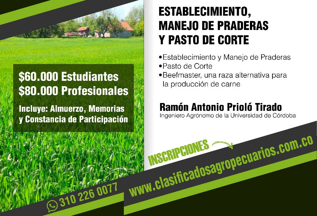 La empresa Clasificados Agropecuarios realizará un nuevo taller sobre para ganaderos y estudiantes sobre el manejo de potreros, pasto de corte y la raza Beefmaster para producción de carne este sábado 2 de junio en Montería (Córdoba). De acuerdo con Jessica García Gaviria, zootecnista y representante legal de Clasificados Agropecuarios, el tema central fue inspirado por los asistentes que participaron en el primer curso sobre formulación y balance de dietas para animales de granja. “Los ganaderos pidieron que la próxima capacitación fuera sobre establecimiento y manejo de praderas, con el fin de bajar los costos en la producción y aumentar la carga animal”, explicó.(Lea: Participe en charla sobre principios de formulación y balance de dietas) Así las cosas, la firma ha preparado un nuevo taller de la mano del ingeniero agrónomo Ramón Antonio Prioló, y de Camilo Peña, médico veterinario zootecnista de la U. de Córdoba y especialista del Instituto de Reproducción Animal de Córdoba (Argentina), quien describió cómo se hará la actividad. “La idea es que los ganaderos también conozcan el manejo de los pastos de corte como alternativa en época de verano, donde tenemos oferta forrajera. Queremos compartir nuestra experiencia en la finca y resolver las inquietudes de los ganaderos”, precisó. Peña también es propietario de la hacienda Las Perlas, lugar donde se llevará a cabo el taller, que está especializada en la producción de carne con la raza Beefmaster, otro de los temas del encuentro.(Lea: Recomendaciones a la hora de cambiar de especie de pasto) “Es una raza interesante para trabajar como alternativa a otras como la Brahman, que está difundida en nuestro país. Las hembras son bastante precoces, la raza tiene mucha fertilidad”, señaló el experto a propósito de la raza sintética, compuesta de Brahman, Shorthon y Hereford. Agregó que gracias al aporte de la raza cebuina, que es del 50%, son animales muy rústicos y adaptados al trópico, mientras que el Hereford aporta en ganancia de peso y el Shorthorn, la habilidad materna para levantar a sus terneros. Por otra parte, el curso de podología equina que estaba programado para el miércoles 30 de mayo fue aplazado para el 28 de julio, que será dirigido por el reconocido actor y presentador Mauricio Vélez. (Lea: Conozca la dinámica del crecimiento de sus praderas) Aún tiene tiempo de inscribirse, consultando el siguiente enlace o escribiendo al Whatsapp al 3102260077. También consulte los perfiles en Facebook e Instagram para mantenerse enterado de todas las capacitaciones y anuncios de la empresa.