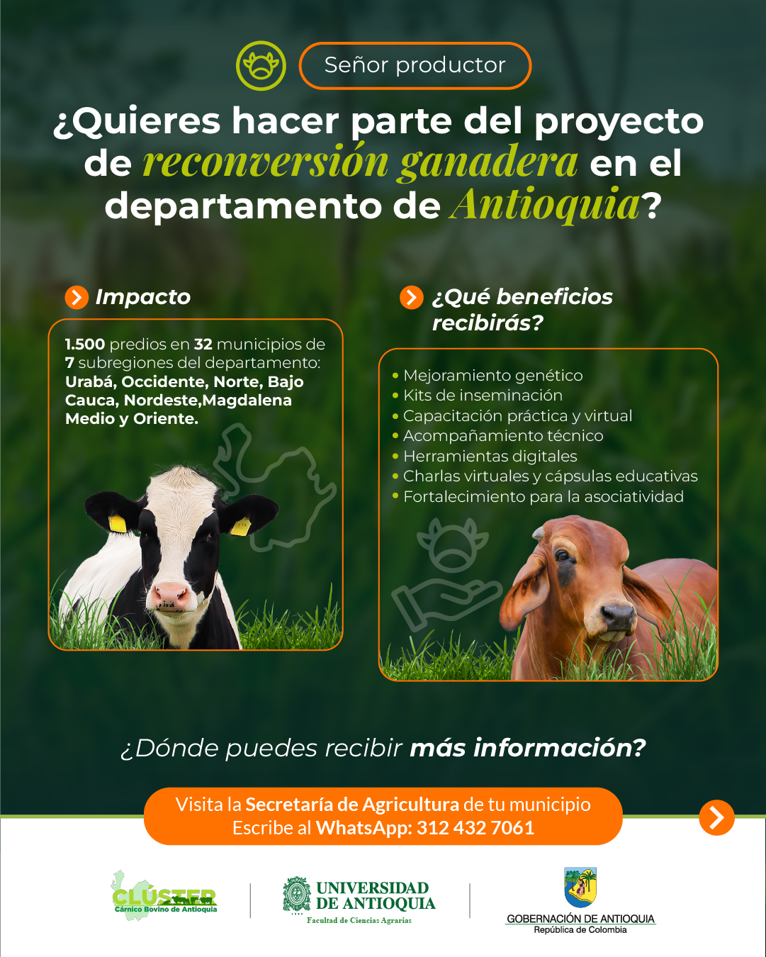 A su vez, 2.500 ganaderos recibirán cápsulas técnicas por WhatsApp, mientras la Universidad de Antioquia dictará 12 charlas virtuales abiertas. (Lea en CONtexto ganadero: Alianza en Antioquia impulsa la ganadería sostenible)