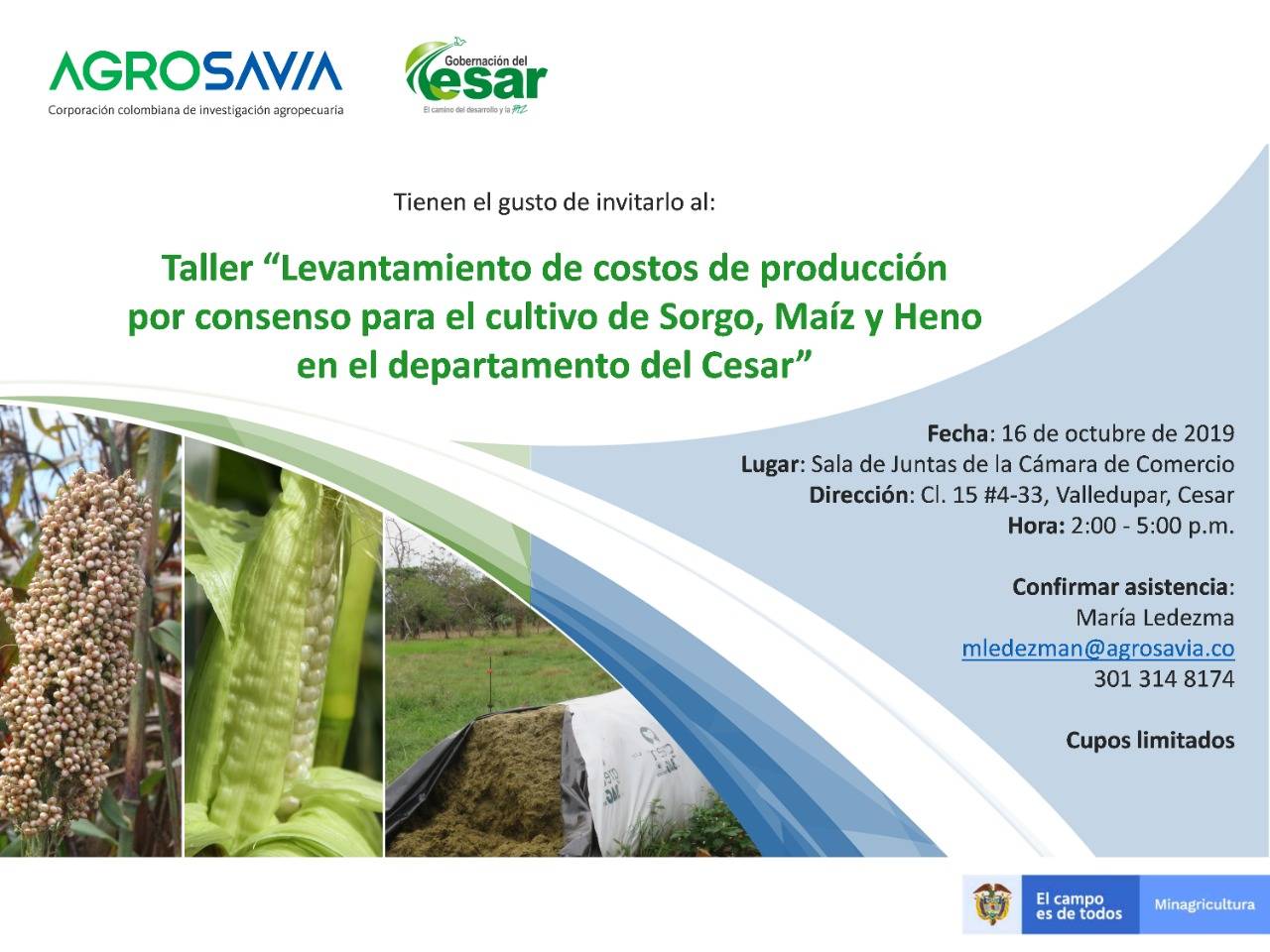 El próximo miércoles 16 de octubre se estará realizando el taller ‘levantamiento de costos de producción por consenso para el cultivo de sorgo, maíz, heno en el departamento del Cesar’.