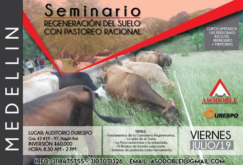 La Asociación Colombiana de Criadores de Ganado Doble Propósito (Asodoble) realizará un seminario sobre regeneración del suelo y pastoreo racional en el municipio de Itagüí cerca de la capital de Antioquia el viernes 19 de julio.
