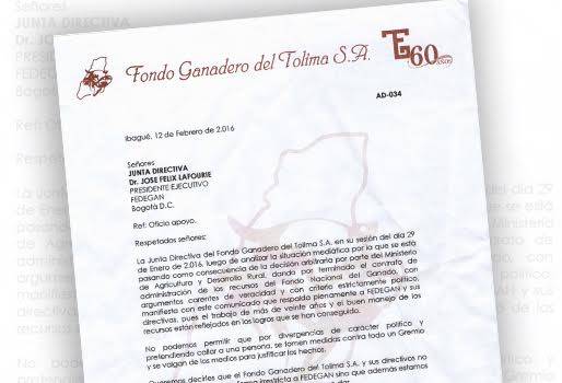 El Fondo Ganadero del Tolima señaló que los argumentos para cambiar a Fedegán como administrador del FNG carecen de verdad y corresponden estrictamente a un carácter político. El pasado 29 de diciembre, el Ministerio de Agricultura y Desarrollo Rural reveló el Decreto 2537, en el que dio a conocer que el Fondo Nacional del Ganado, FNG, dejaba de ser administrado por Fedegán y pasaba a Fiduagraria, por un periodo inicial de 6 meses. Una de las entidades más reconocidas del sector pecuario, el Fondo Ganadero del Tolima, que cuenta con 60 años de trayectoria, hizo llegar a las instalaciones de la Federación Colombiana de Ganaderos, Fedegán, una carta en la que manifiesta al gremio y sus directivos “su respaldo irrestricto”. “No podemos permitir que por divergencias de carácter político y pretendiendo callar a una persona, se tomen medidas contra un gremio y se valgan de todos los medios para justificar los hechos”, asegura el texto firmado por Fernando Melendez Santofimio, presidente de la junta directiva, y Luis Fernando Caicedo Lince, gerente del gremio. (Lea: Fedegán rechaza decisión que le quita la administración del FNG) La decisión de respaldar a la Federación se tomó luego de la reunión de la junta directiva del pasado 29 de enero. Al finalizar la jornada se decidió emitir el comunicado en el que se califica de arbitraria la decisión adoptada por el Ministerio de Agricultura y Desarrollo Rural en la que decidió relevar a Fedegán como entidad administradora de los recursos del Fondo Nacional del Ganado. Según la entidad, dicha determinación se adoptó “con argumentos carentes de veracidad y con criterio estrictamente político”, razón por la que desde el Fondo Ganadero del Tolima afirmaron que se “respalda plenamente a Fedegán y sus directivas, pues el trabajo de más de 20 años y el buen manejo de los recursos están reflejados en los logros que se han conseguido”. Ratifican los firmantes del documento que el apoyo ofrecido al gremio cúpula es “irrestricto” y que el Fondo y sus directivas se encuentra unidos para sumarse “a la lucha que tendremos que dar”. (Lea: Gremios cordobeses respaldan a Fedegán ante determinación sobre FNG) Lo expresado desde Tolima se suma a declaraciones que en el mismo sentido se han hecho escuchar desde otros departamentos como Antioquia, Córdoba, Caldas, Santander y Casanare, entre otros.