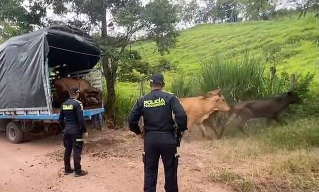 Dos hombres fueron capturados en flagrancia cuando transportaban en un vehículo, 13 semovientes avaluados en más de $35 millones que habían sido hurtados en una finca en el municipio de Supia, en Caldas.